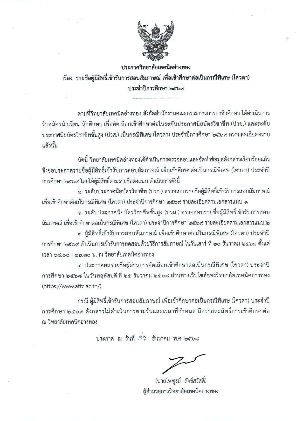 ประกาศรายชื่อผู้มีสิทธ์เข้ารับการสอบสัมภาษณ์ เพื่อเข้าศึกษาต่อเป็นกรณีพิเศษ (โควตา)